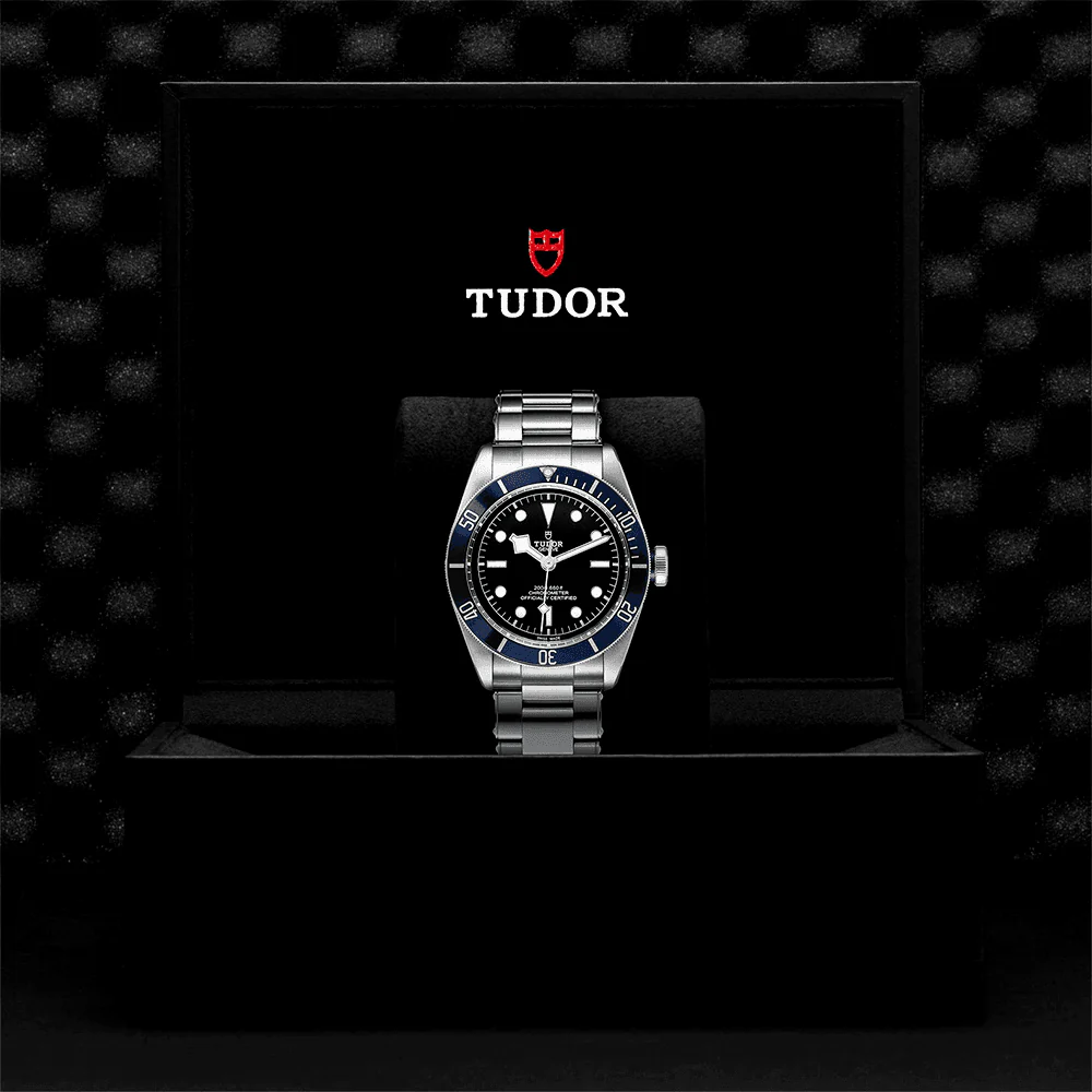 Powered by an in-house chronometer-certified self-winding movement, this rugged and ready Tudor Black Bay watch creates a huge wrist presence, thanks to its confident 41mm stainless steel case. It Features a steel unidirectional rotating bezel topped with a matt blue anodised aluminium disc to show remaining dive minutes. This men’s Tudor Black Bay watch Features retro sporty aesthetics carried through from the company’s original range of 1950’s diving instruments. A domed black dial with grey indexes presents the time legibly alongside a set of chunky luminous coated central hands. The COSC-certified Calibre MT5602 movement will provide the wearer with an impressive 70-hour power reserve for those periods where he wishes to alternate the timepiece with another Tudor favourite. The watch will keep perfect time without missing a beat. This 200-meter water resistant men’s Black Bay watch secures to the wrist with a robust riveted stainless steel bracelet. A highly durable folding clasp promises a close fit against the skin, as well as an innovative safety clasp. The steel screw-down winding crown on this watch is adorned with an engraving of Tudor’s iconic rose motif. Its surface has also been black lacquered and finished with a blue anodised aluminium winding crown tube to match the finish on the diver’s bezel.