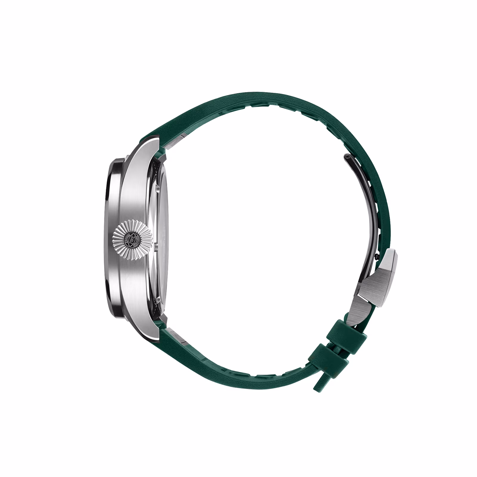Housed in a 46.2mm stainless steel case with an oversized conical crown reminiscent of an historic observation watch from the 1940s, this watch fastens securely with a racing green rubber strap.