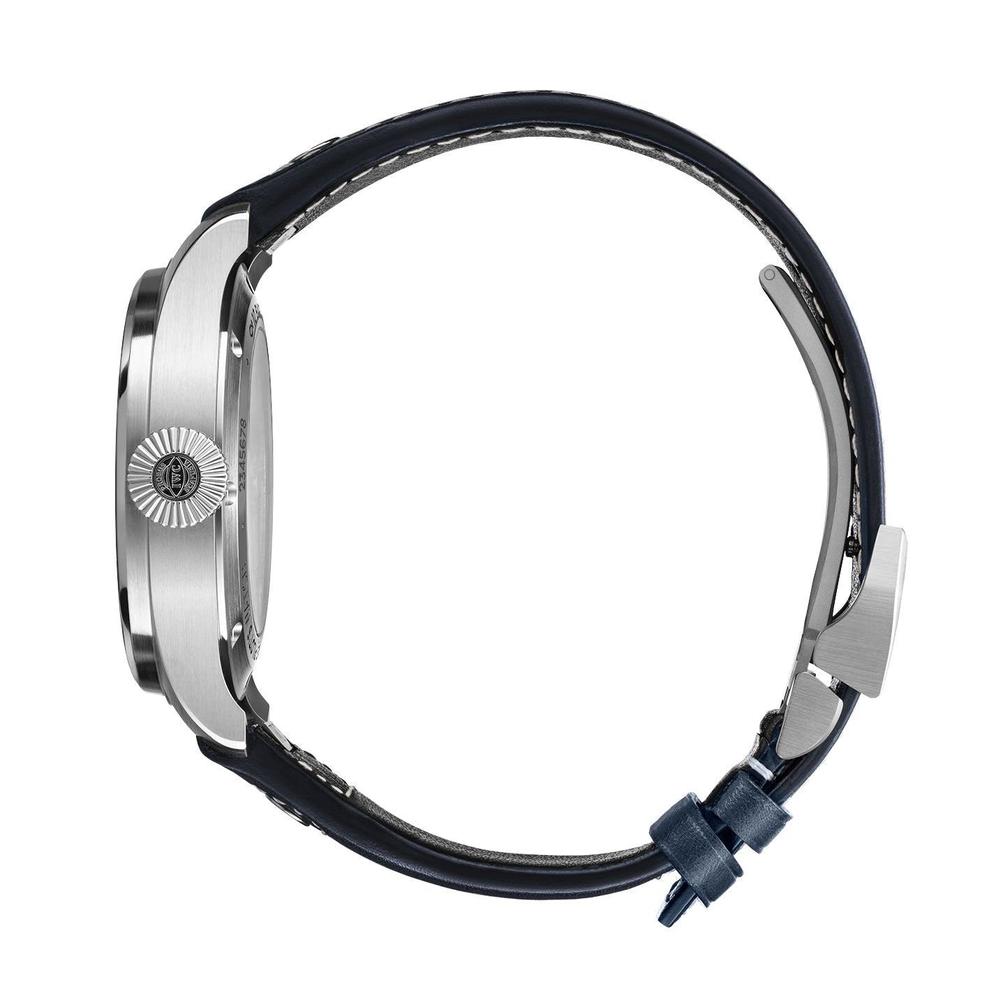 - Presented in a 43 mm stainless steel case and secured by a blue leather strap with quick release technology