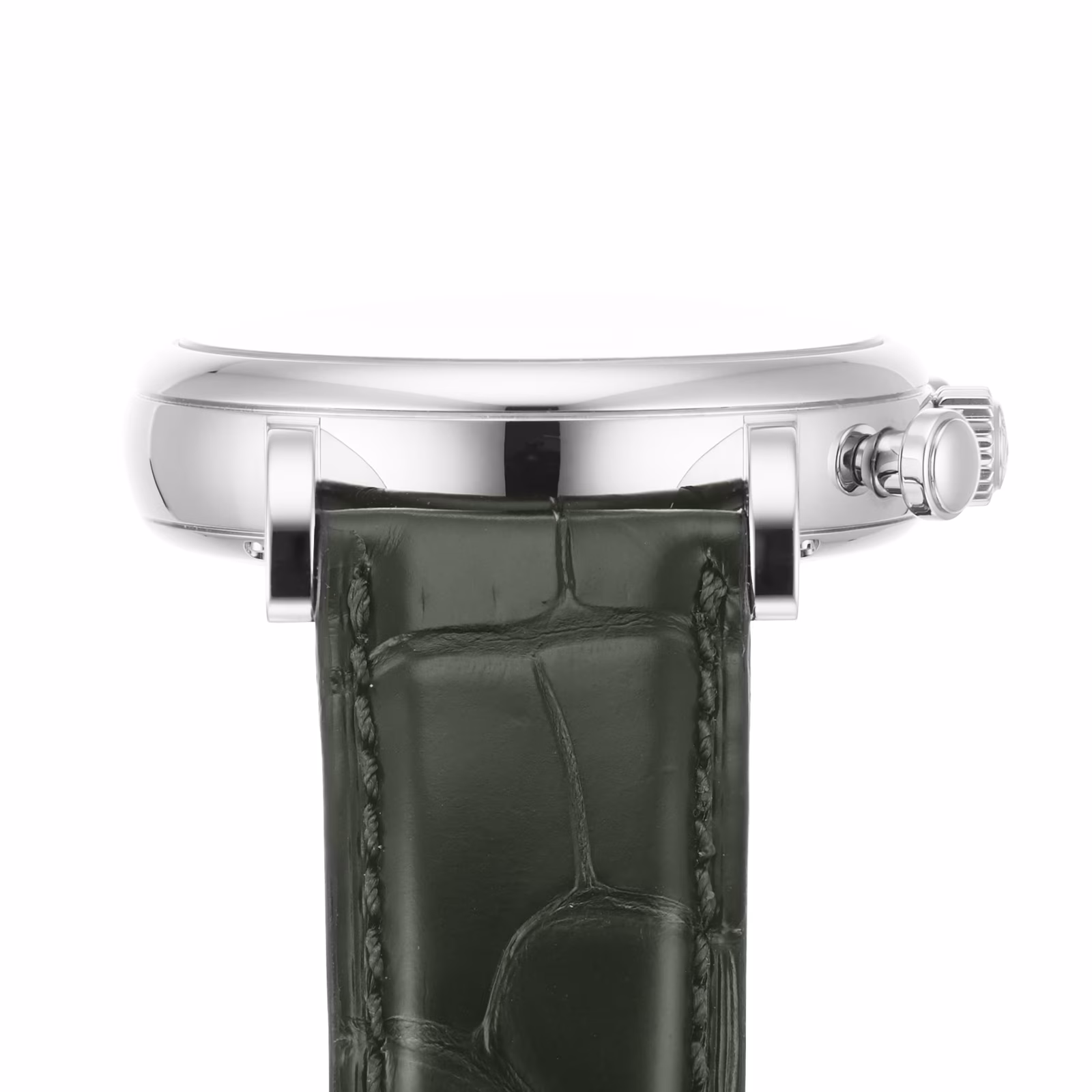 Providing this timepiece with style and security, this robust 39mm model is presented on a green alligator leather strap secured by a stainless-steel pin buckle fastening.