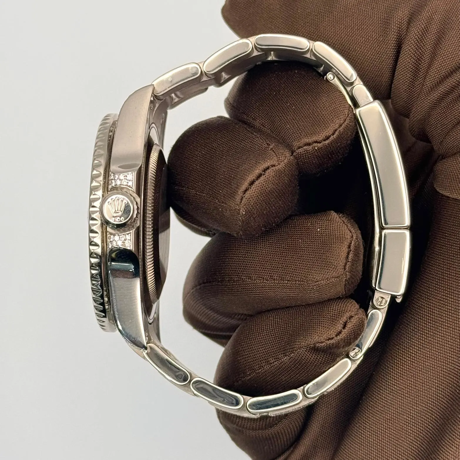 ROLEX116759$A is a diamond and sapphire studded 40 mm diameter large case of 18 K white gold. Richly ormamented piece with pave diamonddial and 18 K white gold bezel embellished with 29 diamonds and 30 endearing sapphires.The gleaming diamond dial is having hour markers, 24 hour hand and independent 12 hour hand with the date displayed. The oyster fip lockbracelet and screw down crown are holding the beautiful dial and case. Automatic chronometer movement, sapphire crystal and solid white goldcase back are high features of this festive luxurious watch which are an adorable combination of beauty and durability.
