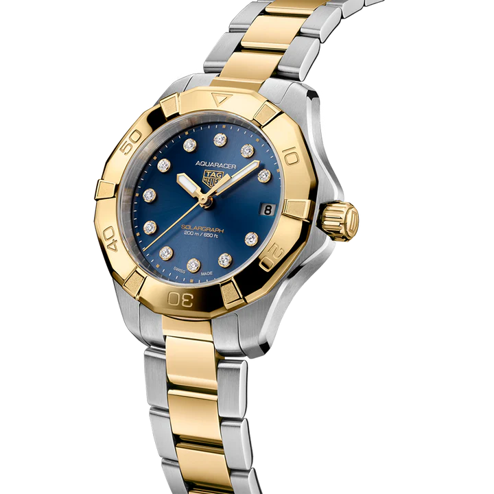 The TAG Heuer Aquaracer Professional 200 Solargraph merges elegance and resilience in a striking two-tone design of polished steel and 18K 2N yellow gold. Powered by the Solargraph technology, this refined timepiece is ready for any journey, from urban settings to the depths of the wild.
