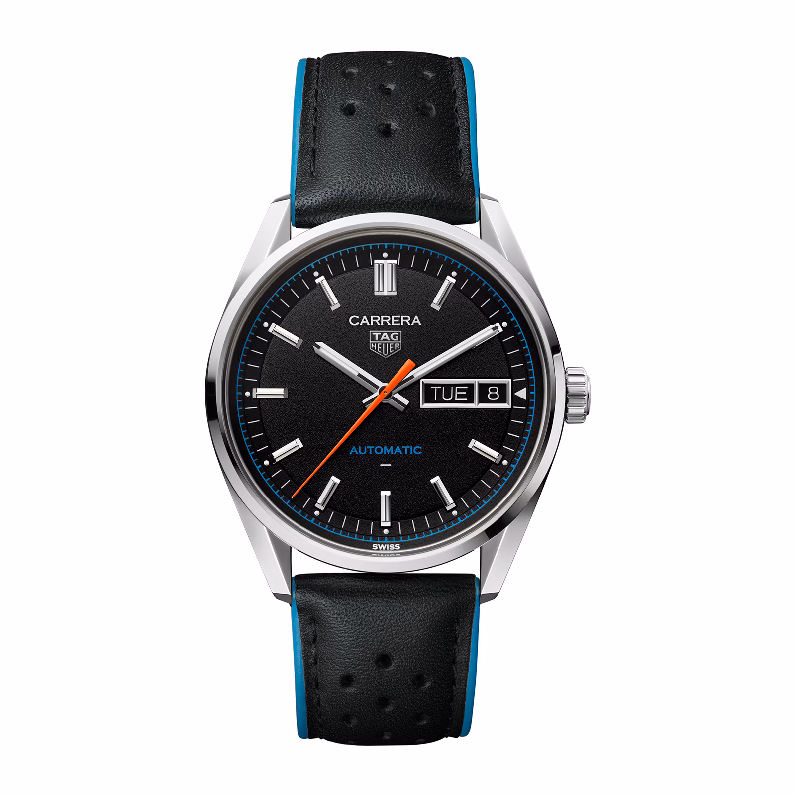 The TAG Heuer Carrera Day-Date (41mm) combines an elegant black grained dial with the TH31-02 manufacture movement. Offering 80 hours of power reserve, this versatile timepiece features a comfortable perforated black leather strap and a customizable CAPSA system, making it the perfect blend of elegance and functionality. With a Victory Wreath engraved on the caseback, it’s a symbol of enduring success.