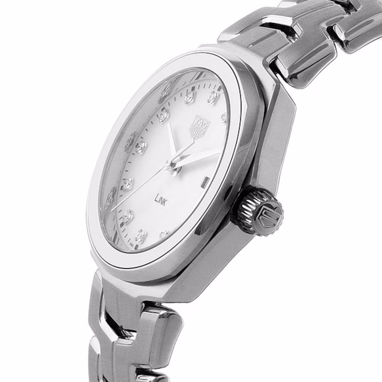 - Natural white mother-of-pearl dial with silver-toned hands and glistening diamond indexes
