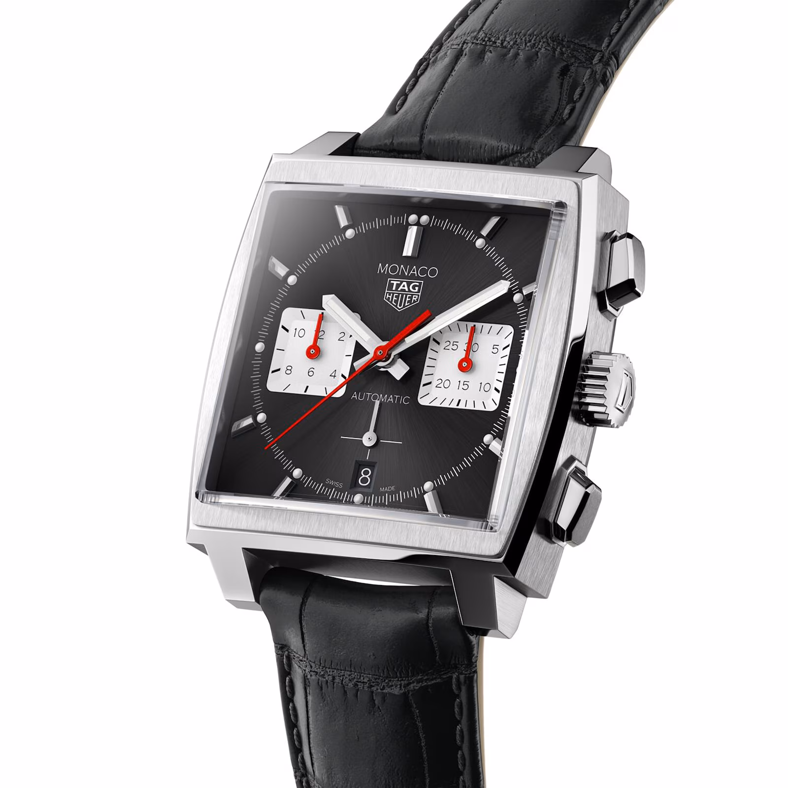 Protected by a bevelled sapphire crystal dome, the bold black dial boasts a sunray-brushed finish, two square sub-dials, a date display at 6 oclock, and high contrast red details.
