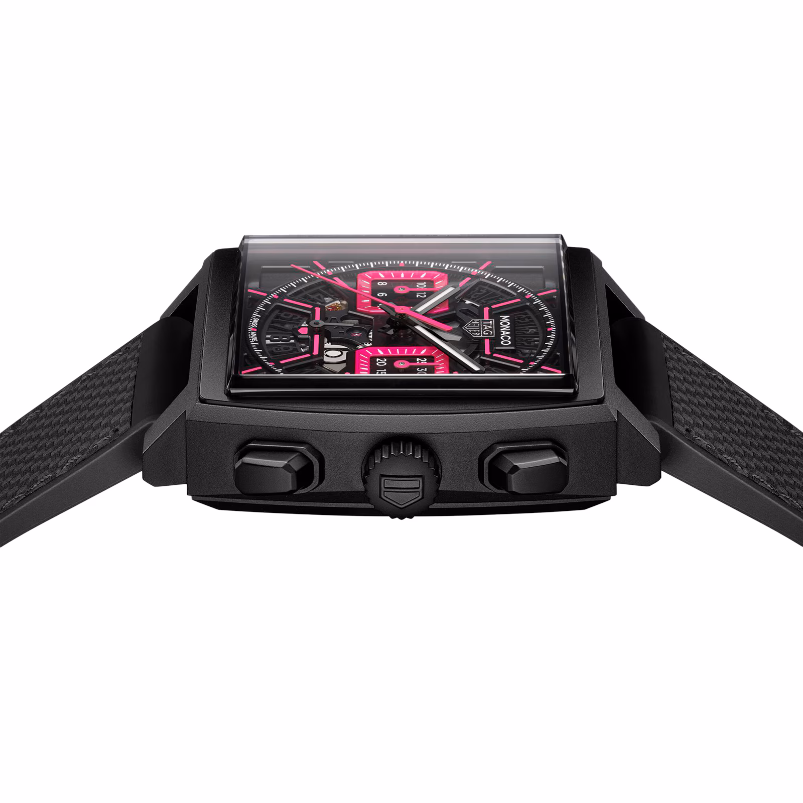<p>This pink edition of the Monaco Chronograph pushes boundaries yet again with its striking dial, setting the skeleton black frame against a vibrant pink. A true statement piece for the unconventional wearer, it embodies the spirit of individuality.</p>