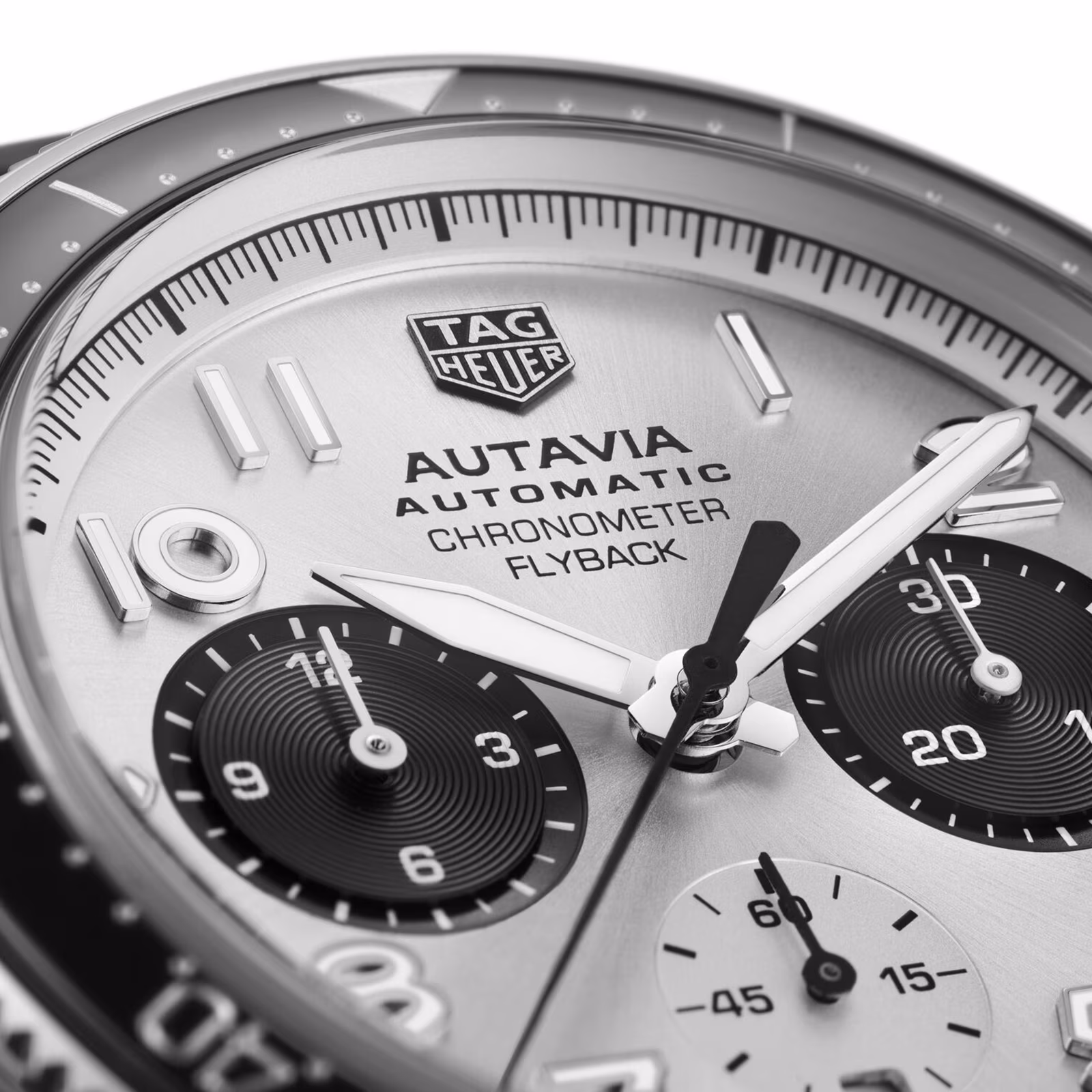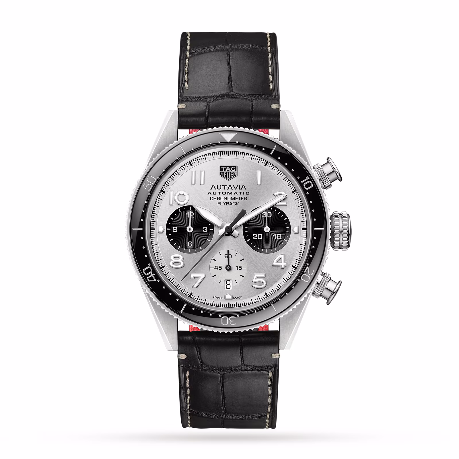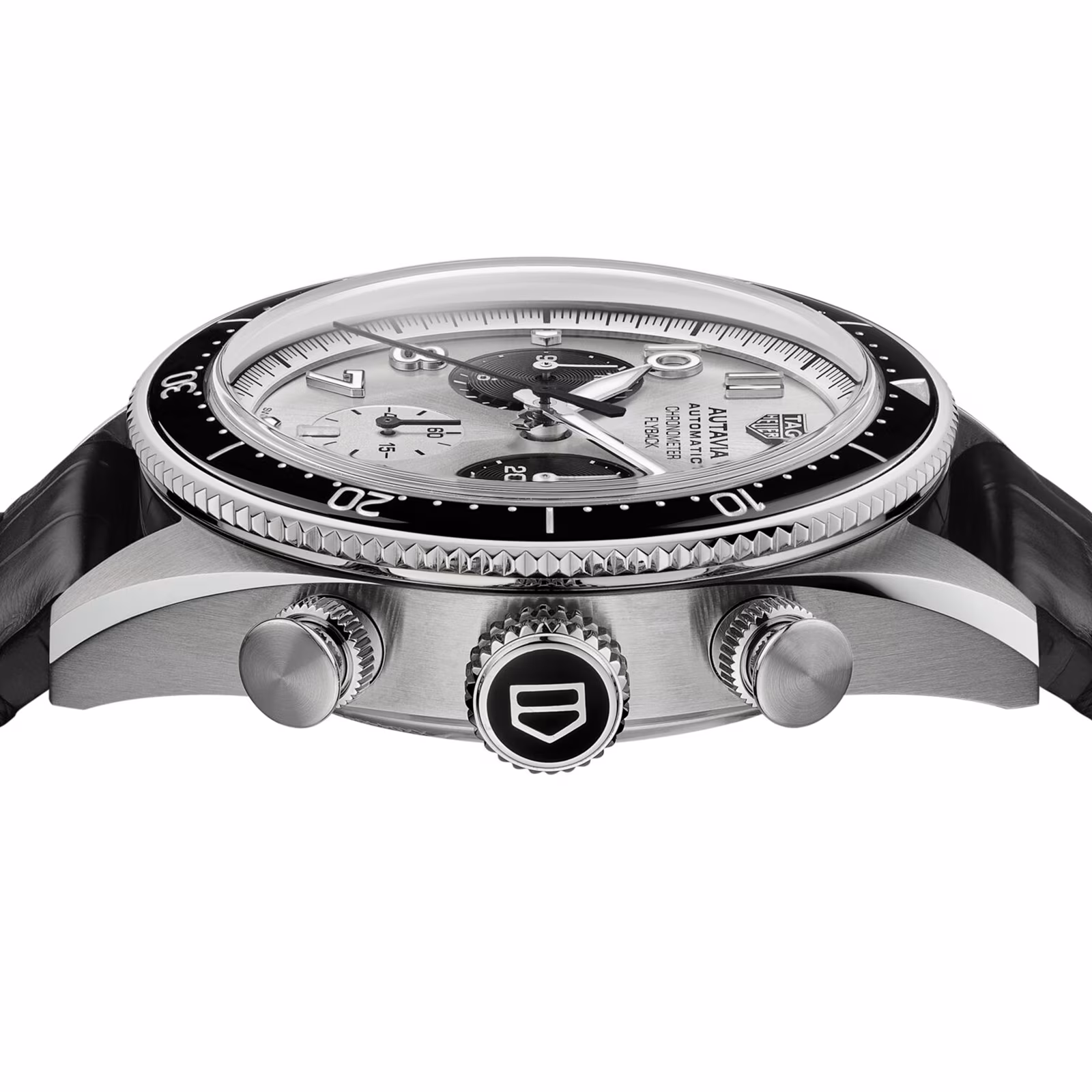 This Autavia Chronometer Flyback model is ready for any adventure, with a heroic silver dial with enhanced legibility, while the calibre 02 Flyback movement allows for the recording of laps via the rapid restarting of the timer function.